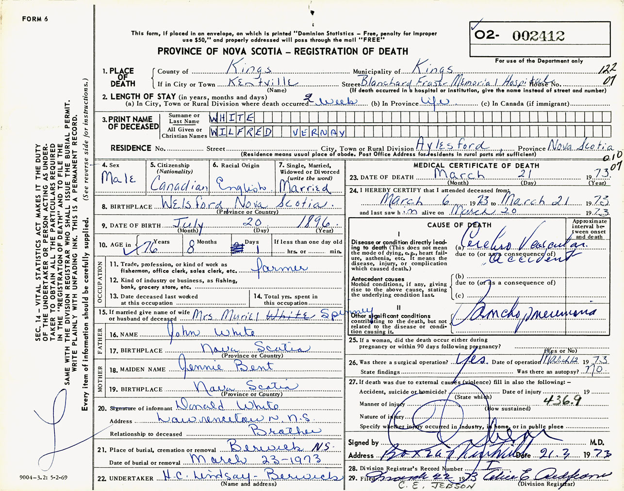 Male Death Registration: Year: 1973 number: 2412