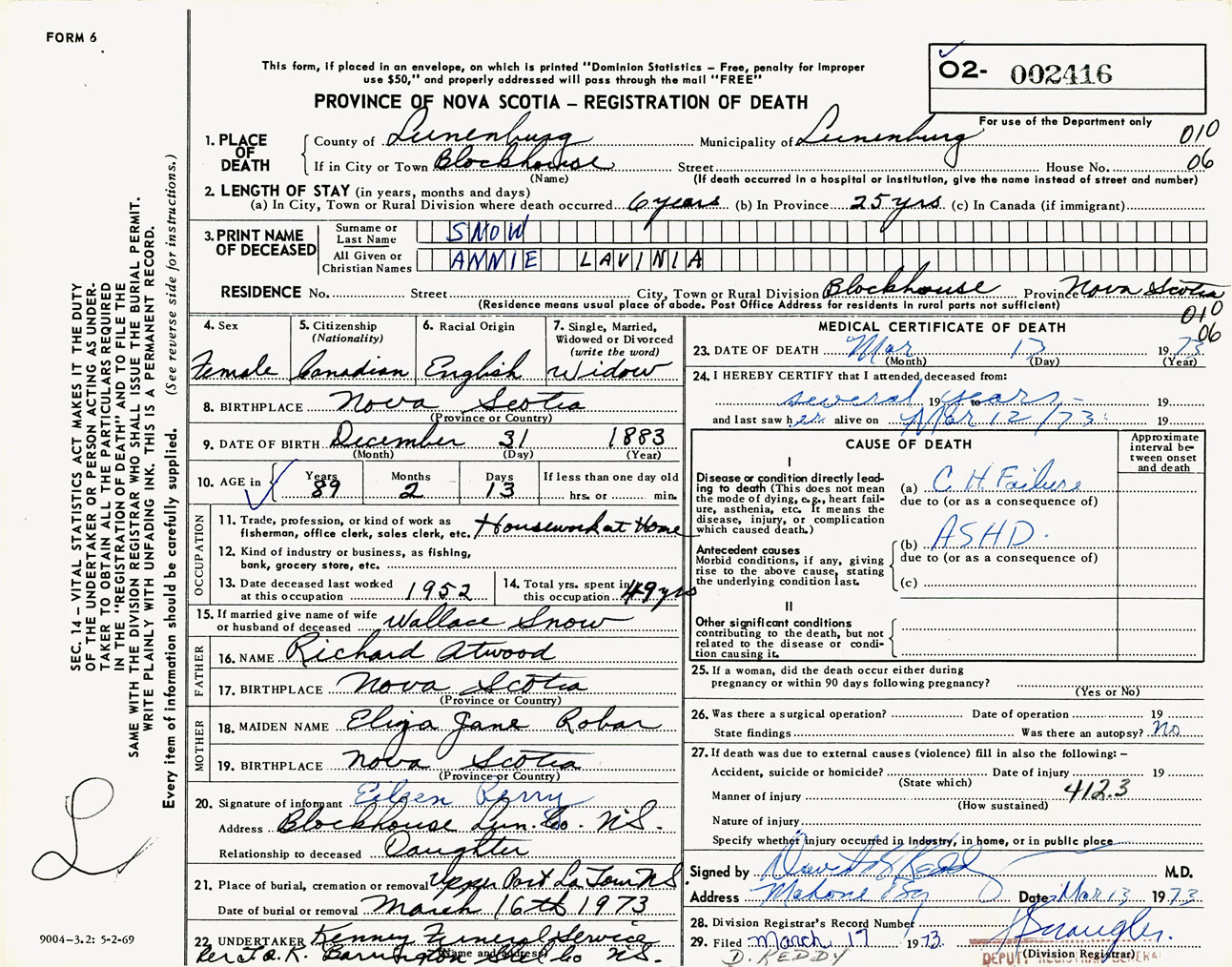 Female Death Registration: Year: 1973 number: 2416