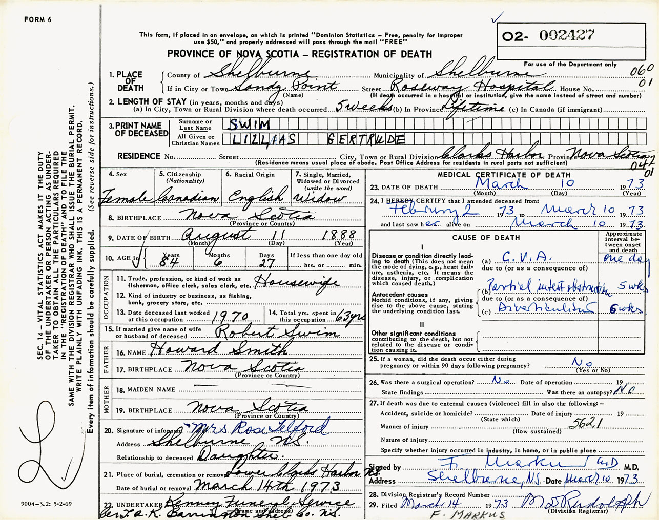 Female Death Registration: Year: 1973 number: 2427