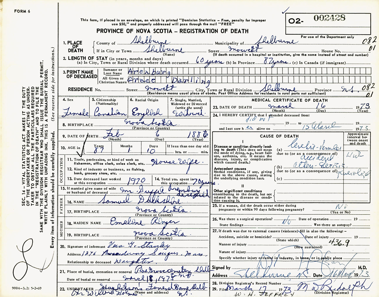 Female Death Registration: Year: 1973 number: 2428