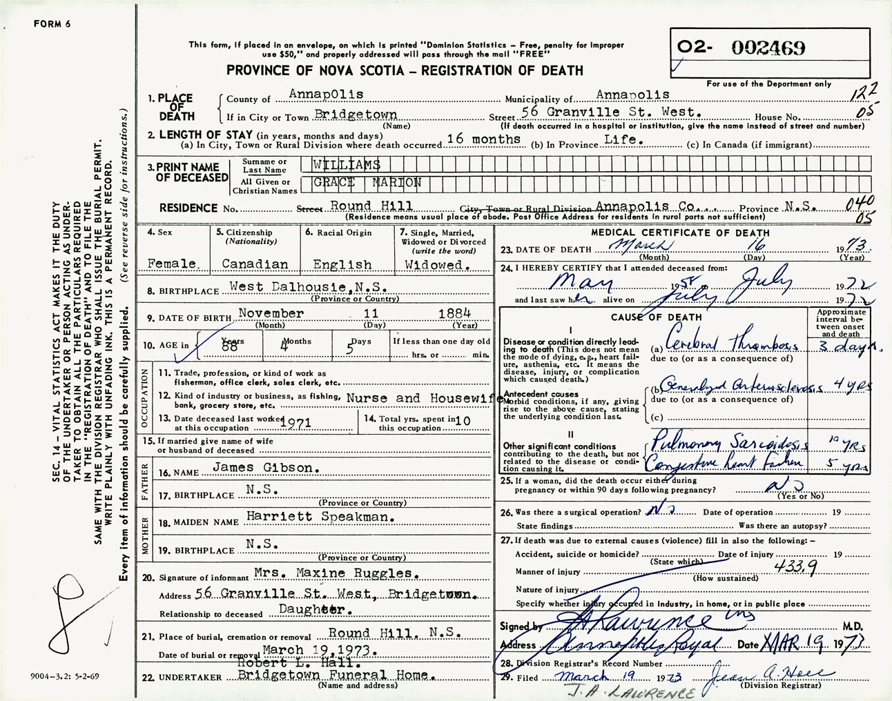 Female Death Registration: Year: 1973 number: 2469