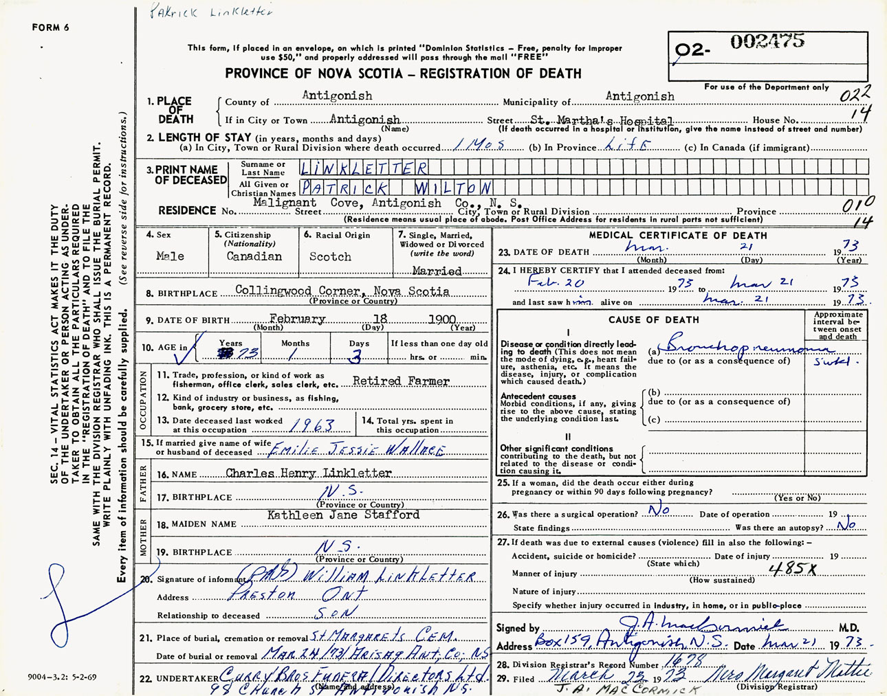 Male Death Registration: Year: 1973 number: 2475