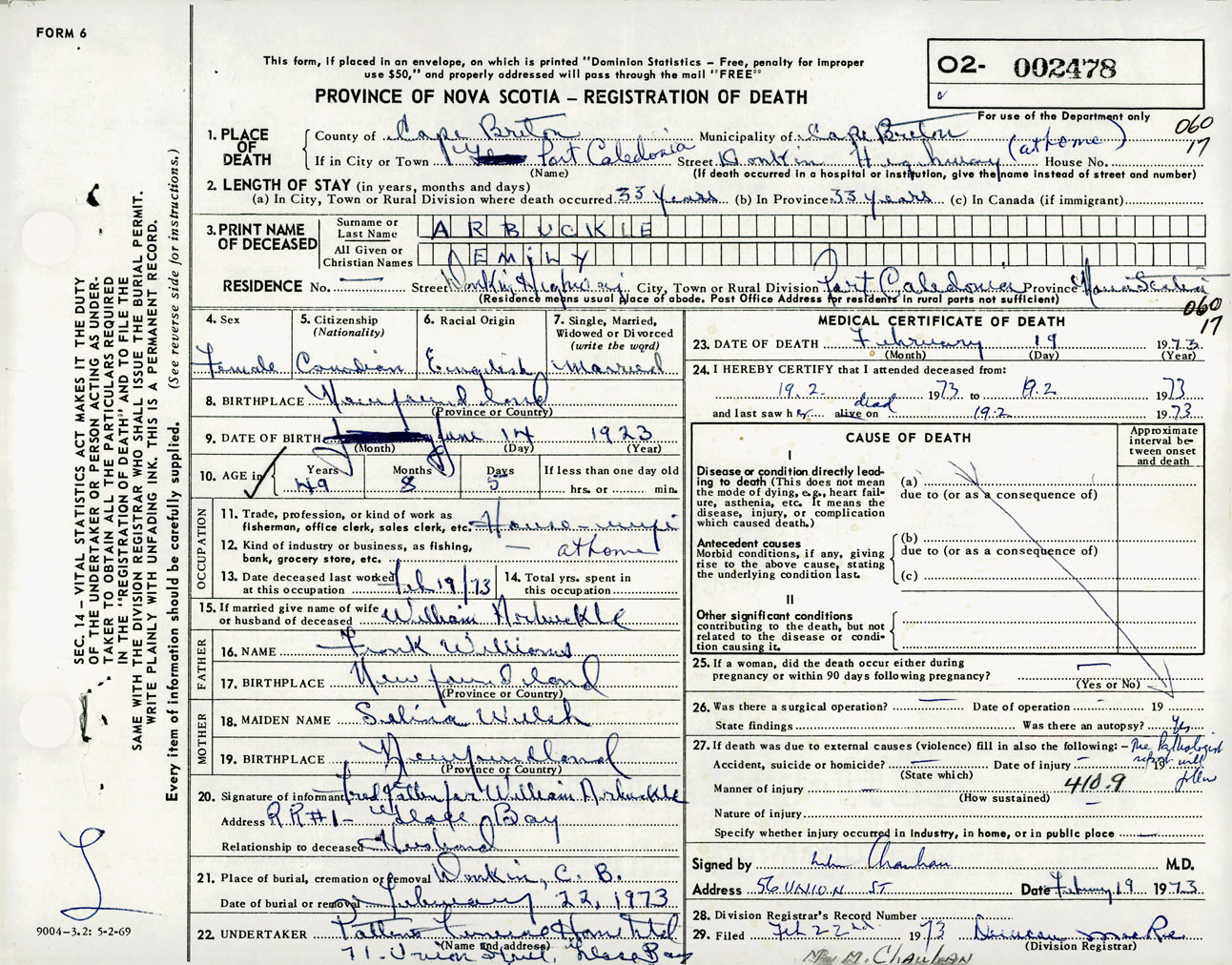 Female Death Registration: Year: 1973 number: 2478