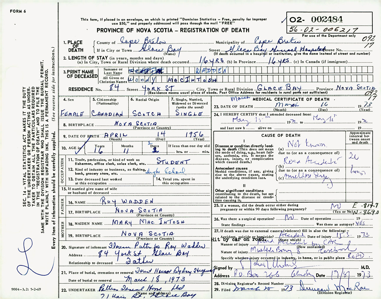 Female Death Registration: Year: 1973 number: 2484