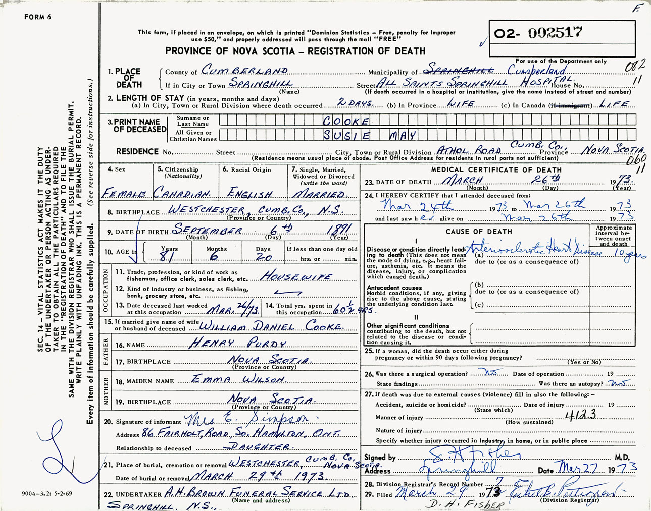 Female Death Registration: Year: 1973 number: 2517