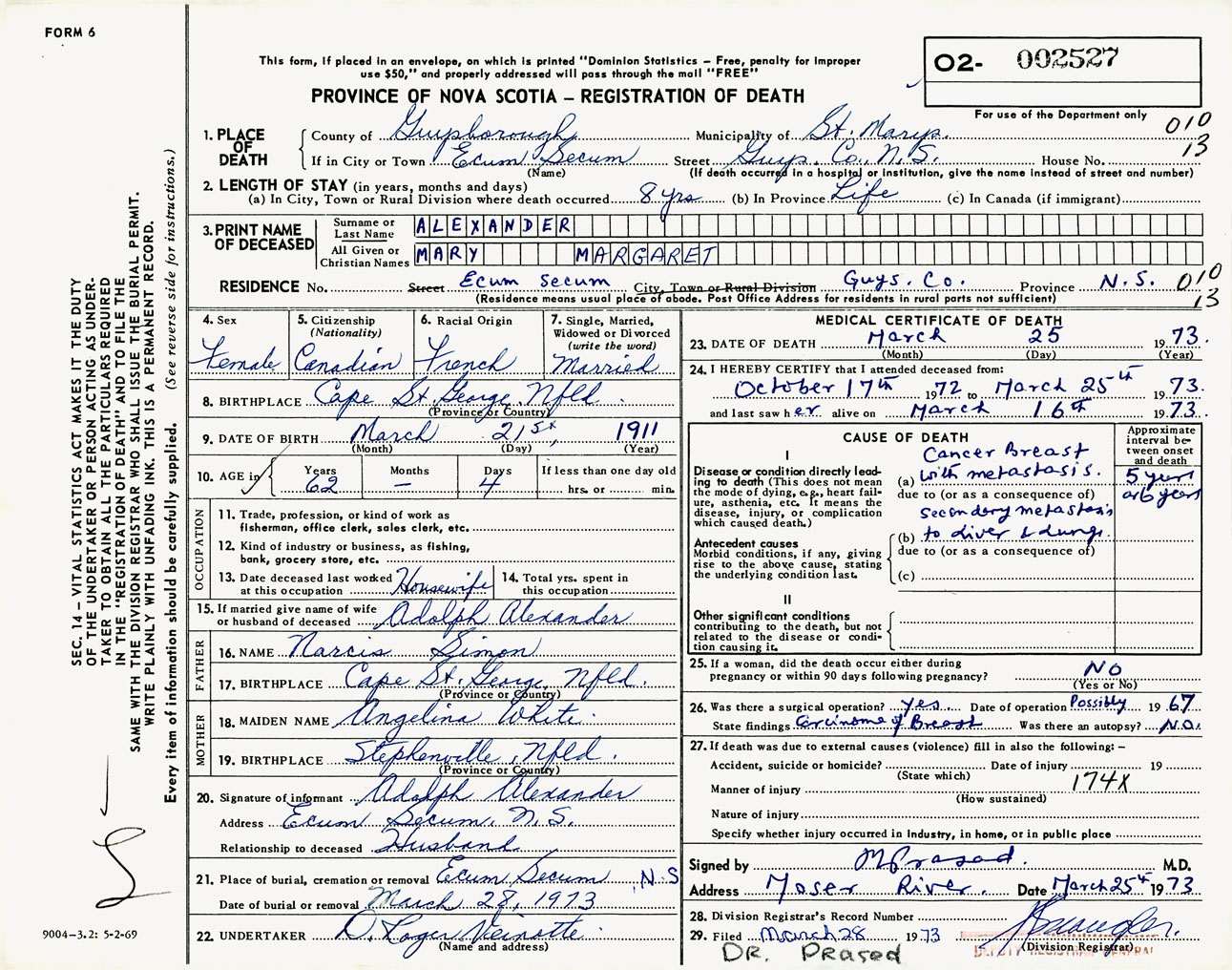 Female Death Registration: Year: 1973 number: 2527