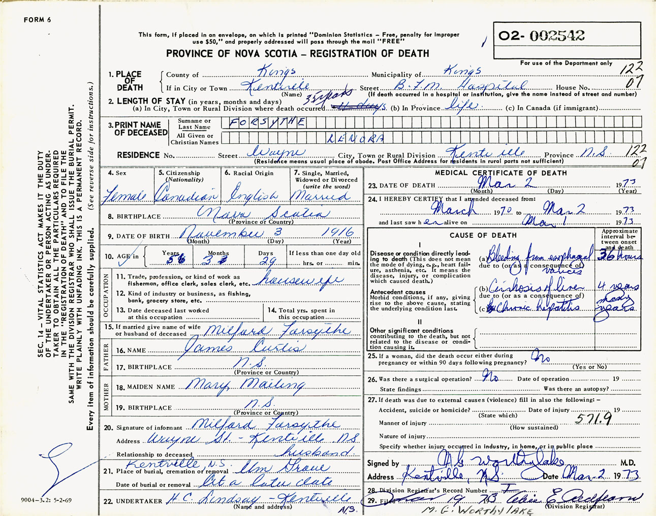 Female Death Registration: Year: 1973 number: 2542