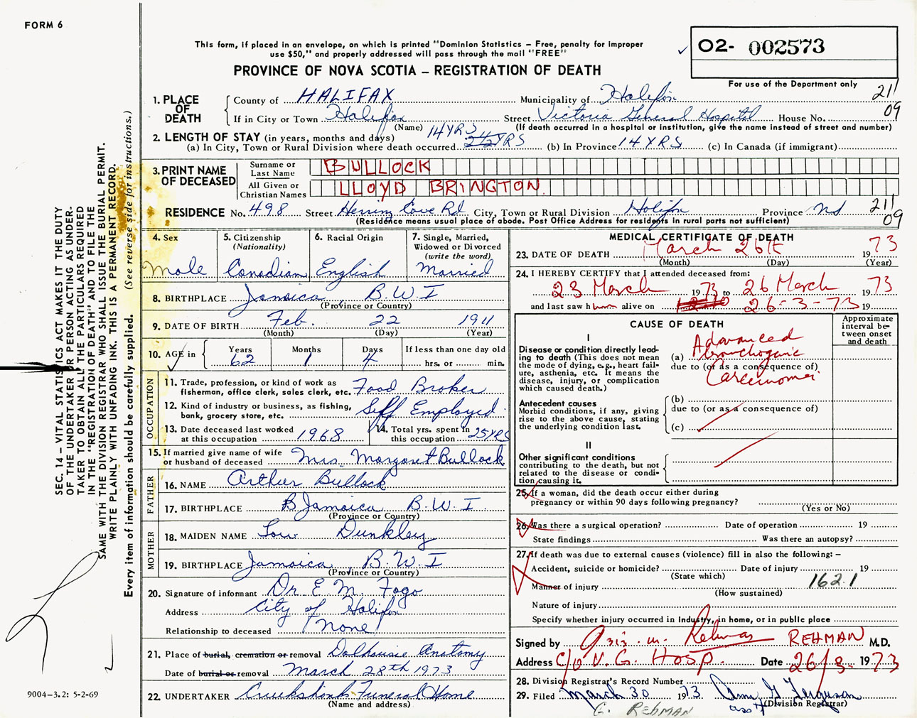 Male Death Registration: Year: 1973 number: 2573