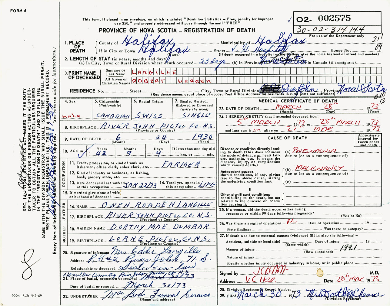 Male Death Registration: Year: 1973 number: 2575