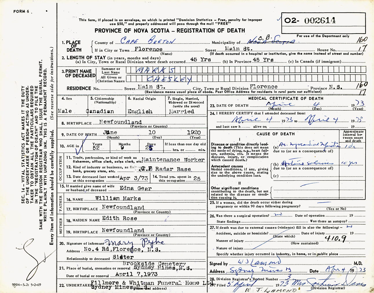 Male Death Registration: Year: 1973 number: 2614