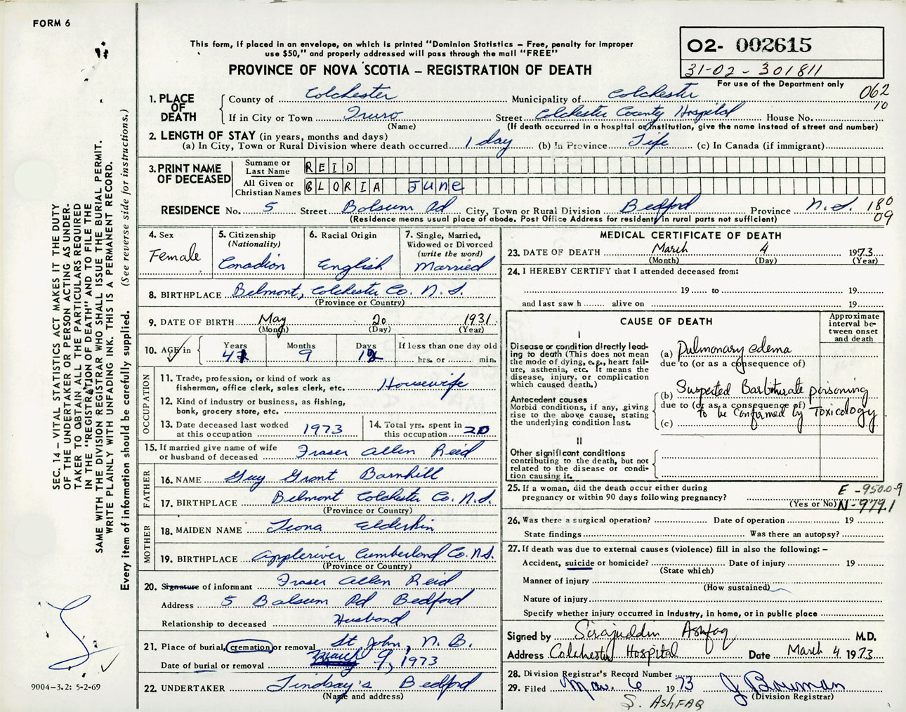 Female Death Registration: Year: 1973 number: 2615