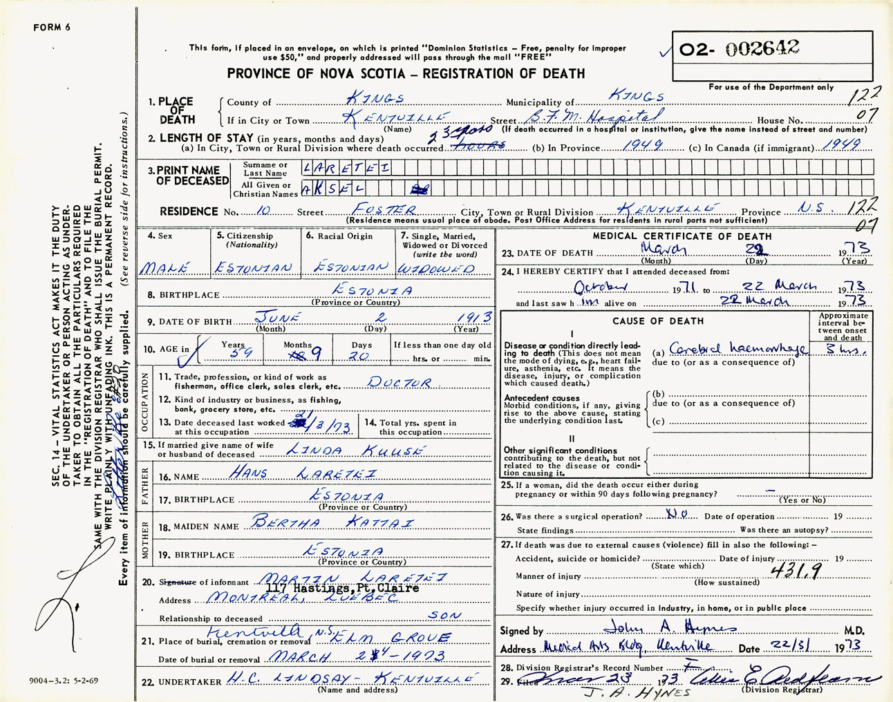 Male Death Registration: Year: 1973 number: 2642