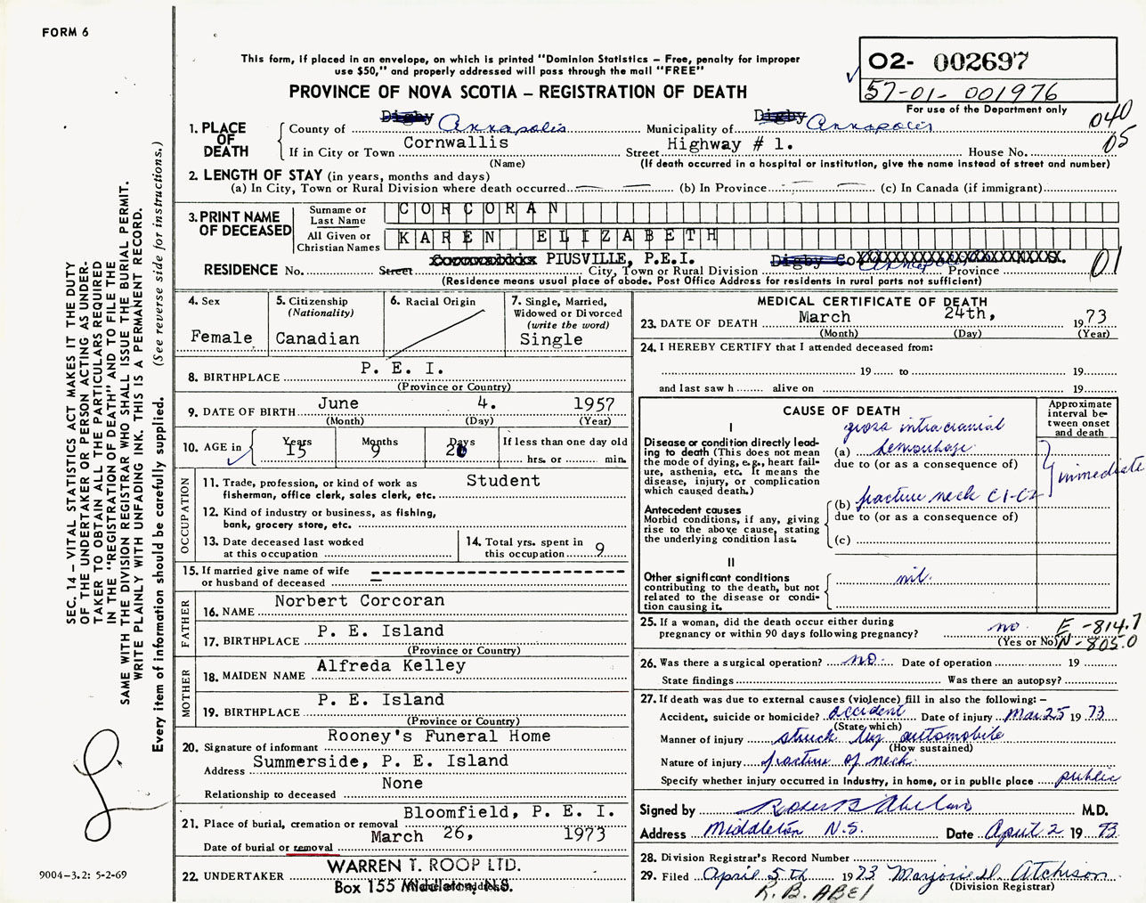 Female Death Registration: Year: 1973 number: 2697