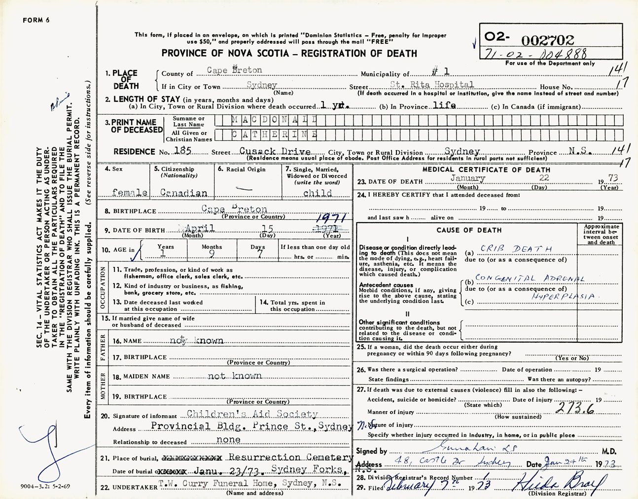 Female Death Registration: Year: 1973 number: 2702