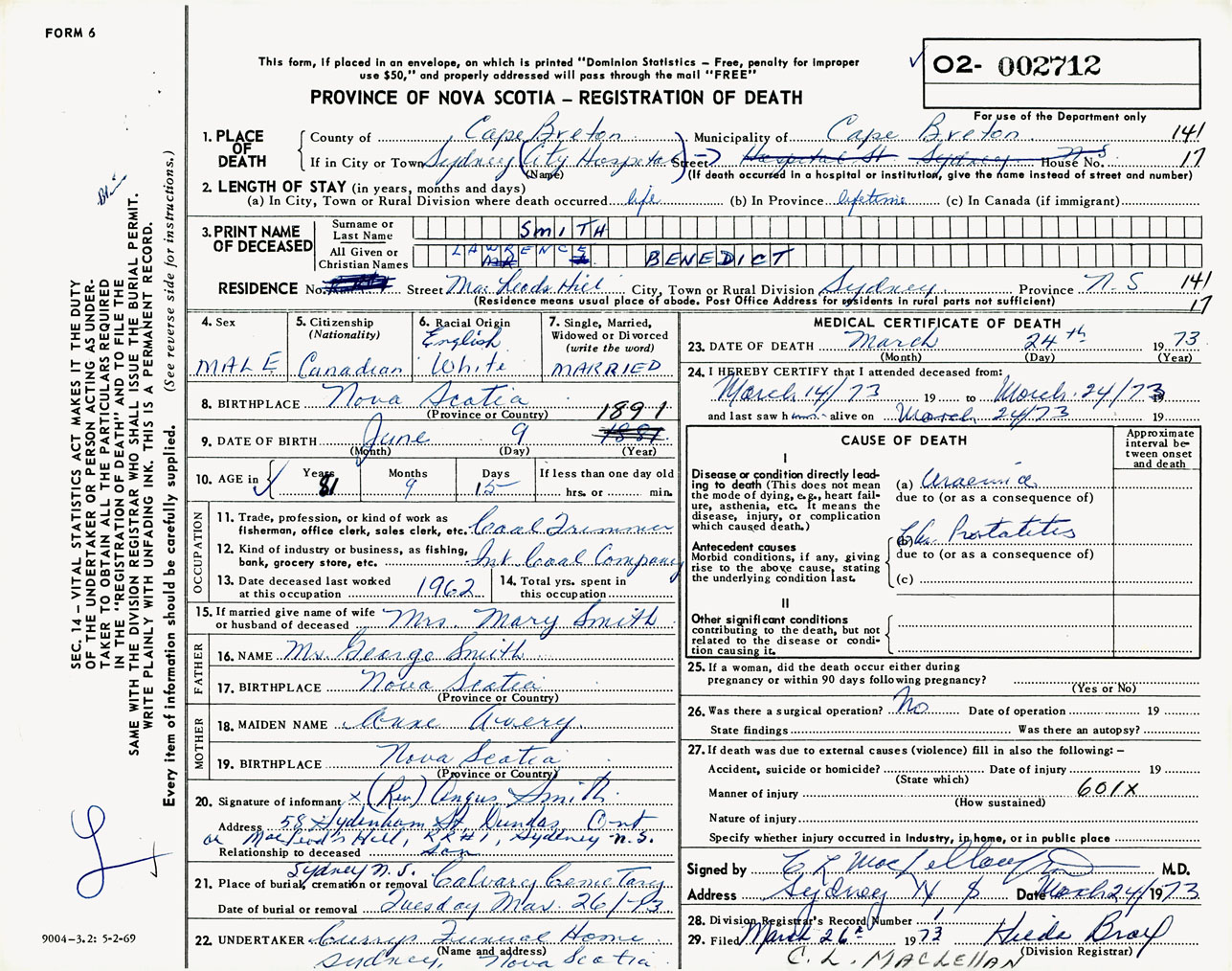 Male Death Registration: Year: 1973 number: 2712