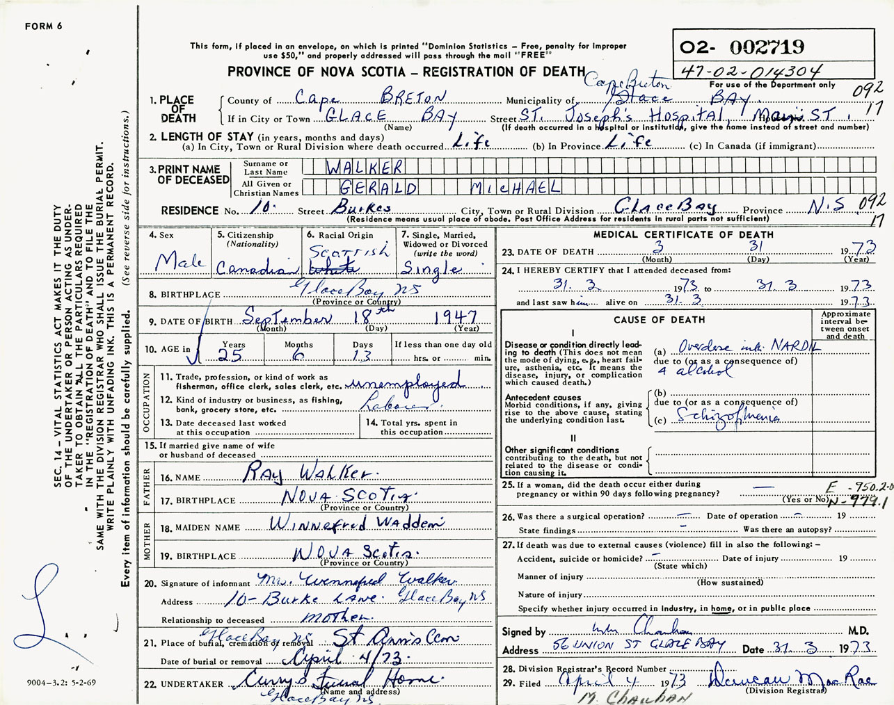 Male Death Registration: Year: 1973 number: 2719