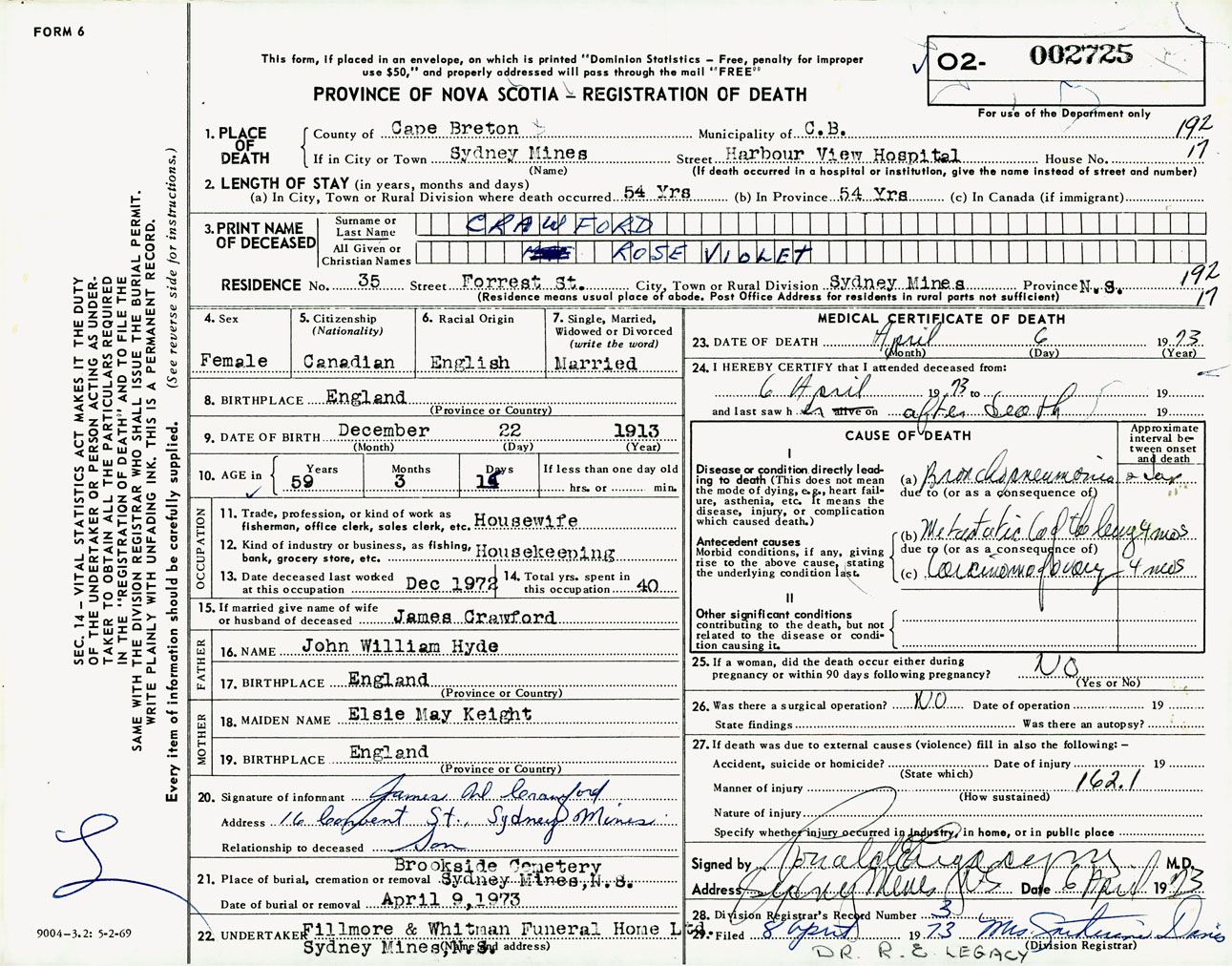 Female Death Registration: Year: 1973 number: 2725