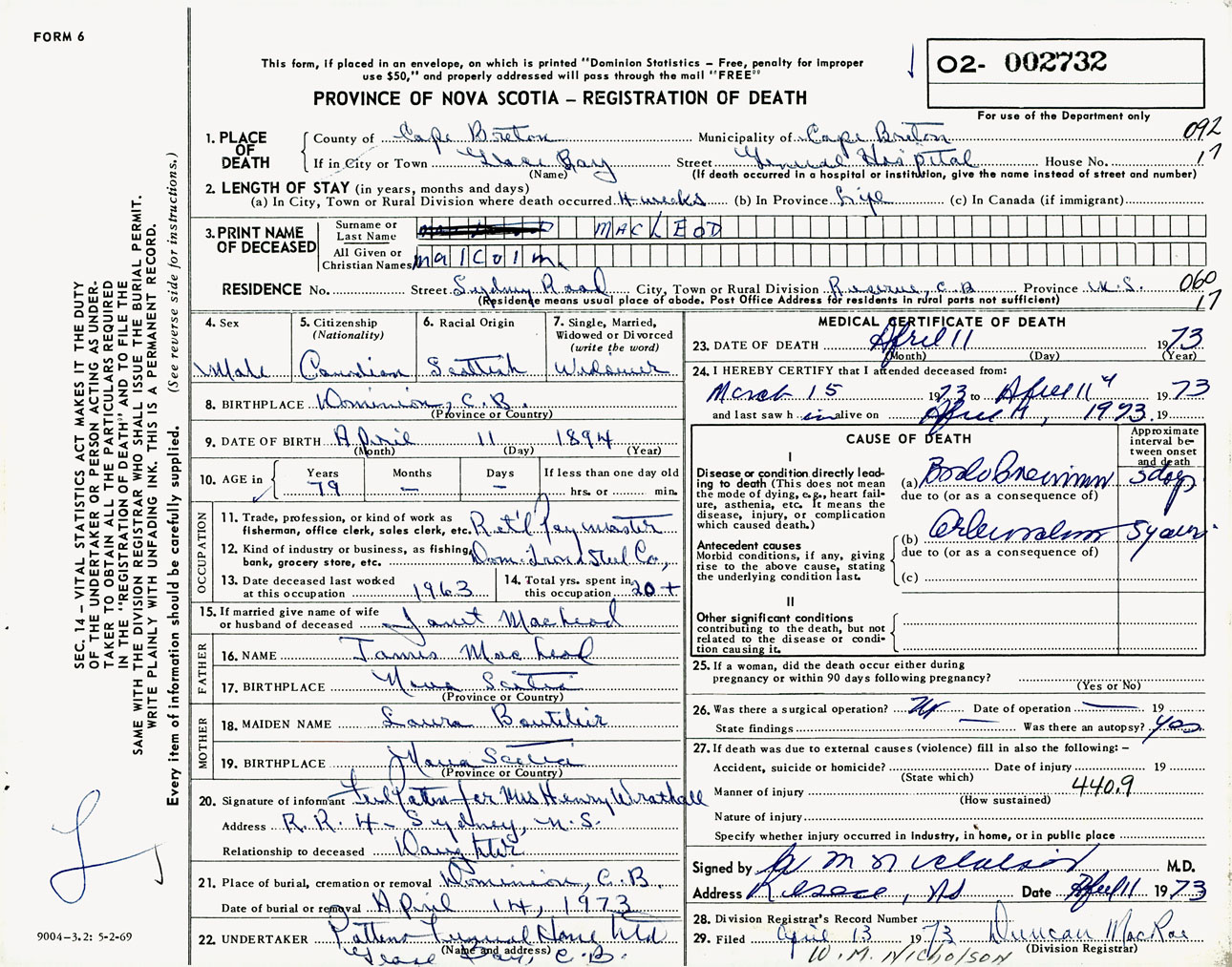 Male Death Registration: Year: 1973 number: 2732