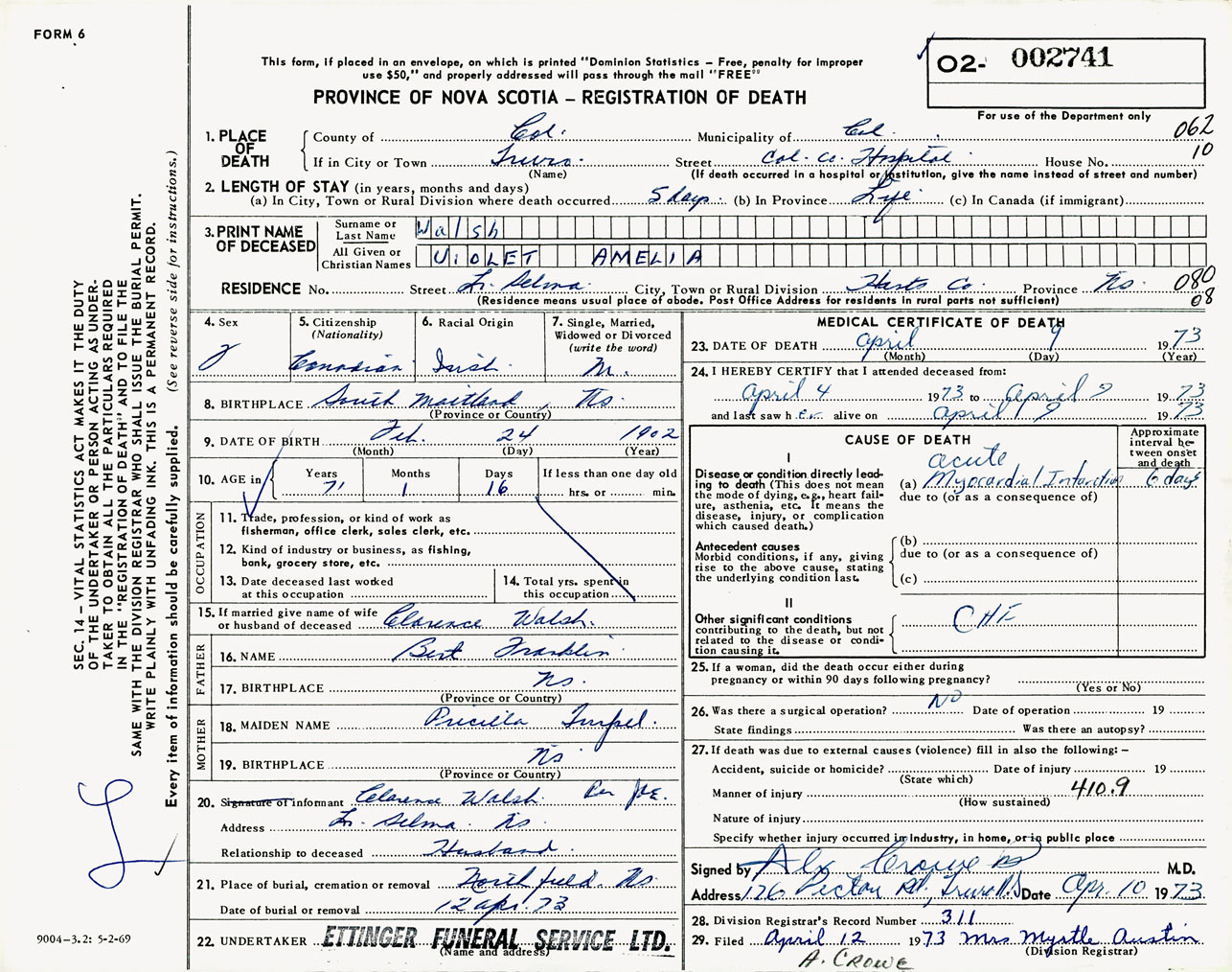Female Death Registration: Year: 1973 number: 2741