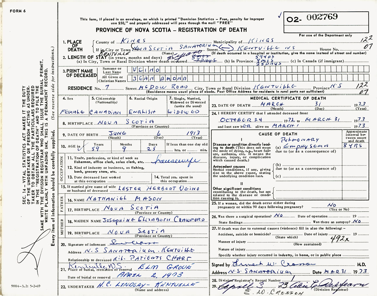 Female Death Registration: Year: 1973 number: 2769