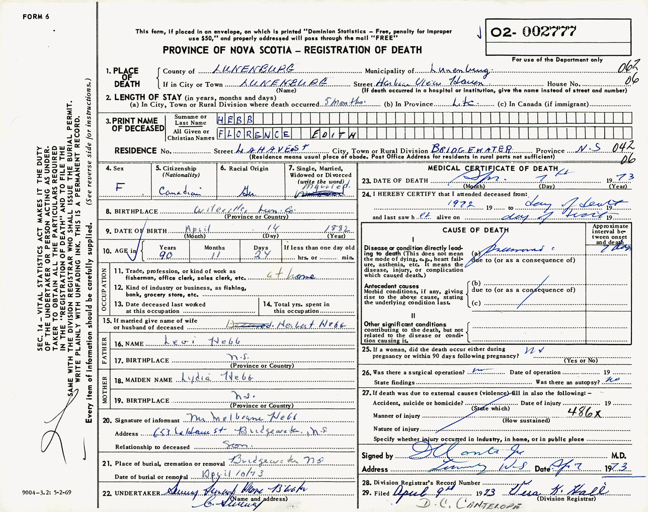 Female Death Registration: Year: 1973 number: 2777