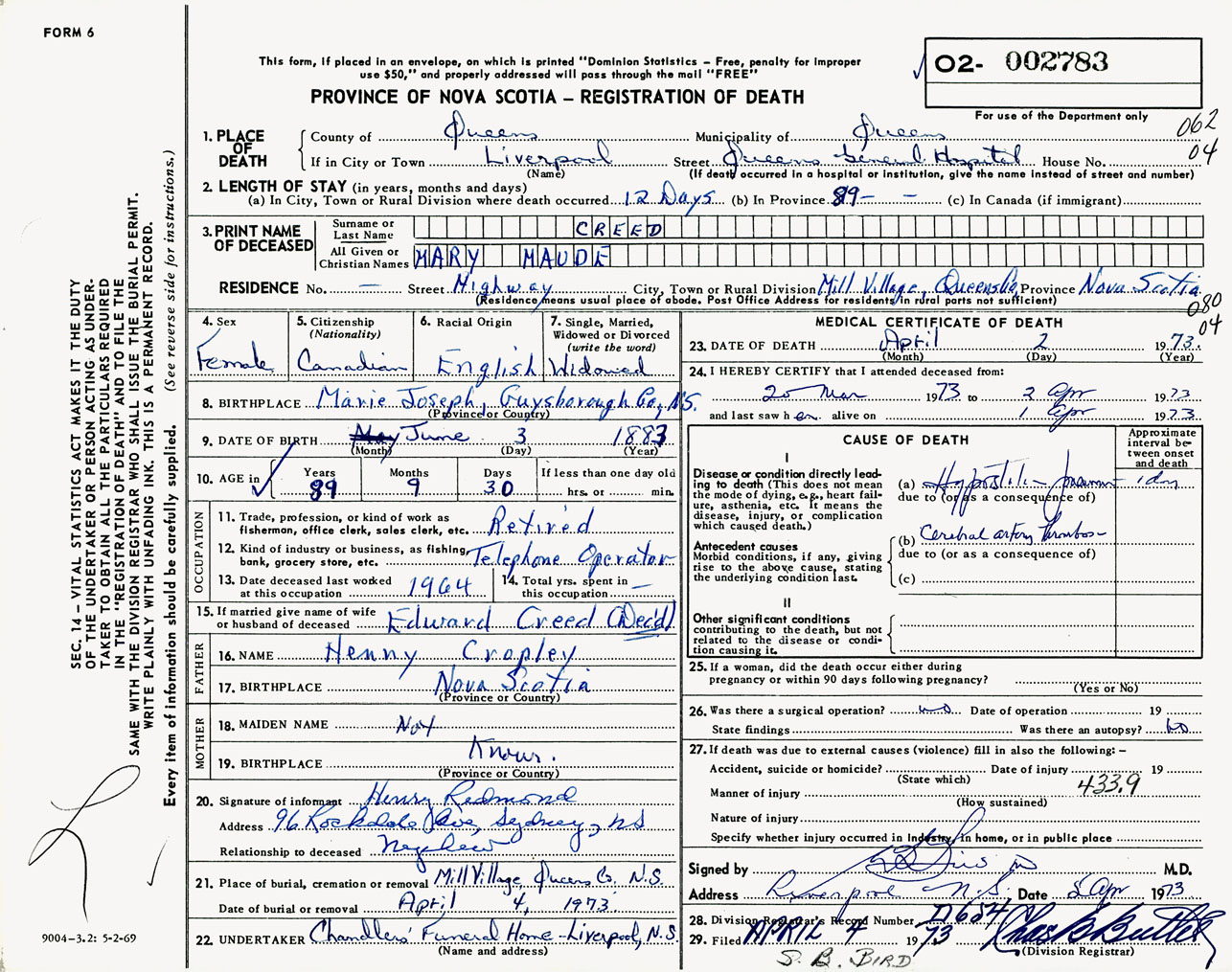 Female Death Registration: Year: 1973 number: 2783