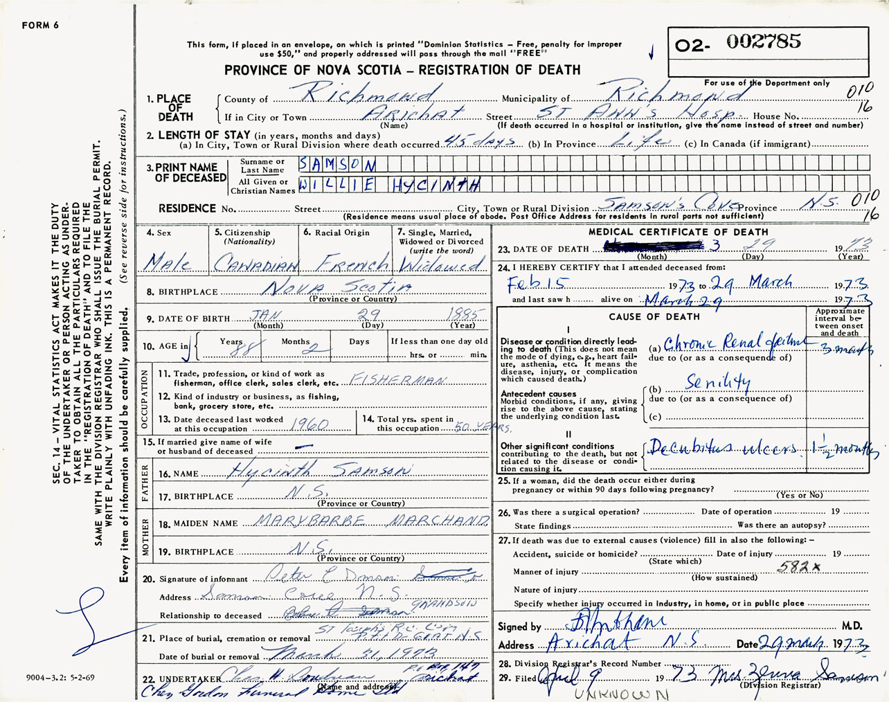 Male Death Registration: Year: 1973 number: 2785