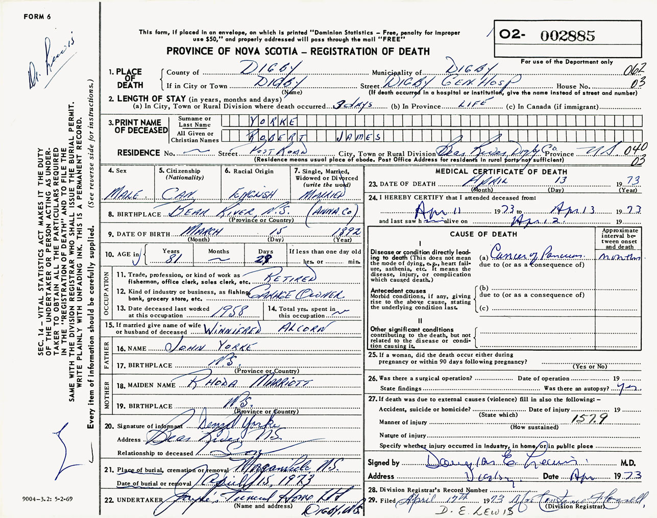 Male Death Registration: Year: 1973 number: 2885