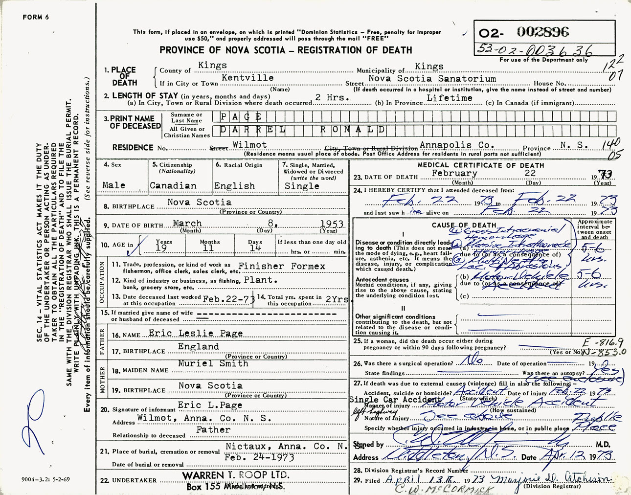 Male Death Registration: Year: 1973 number: 2896