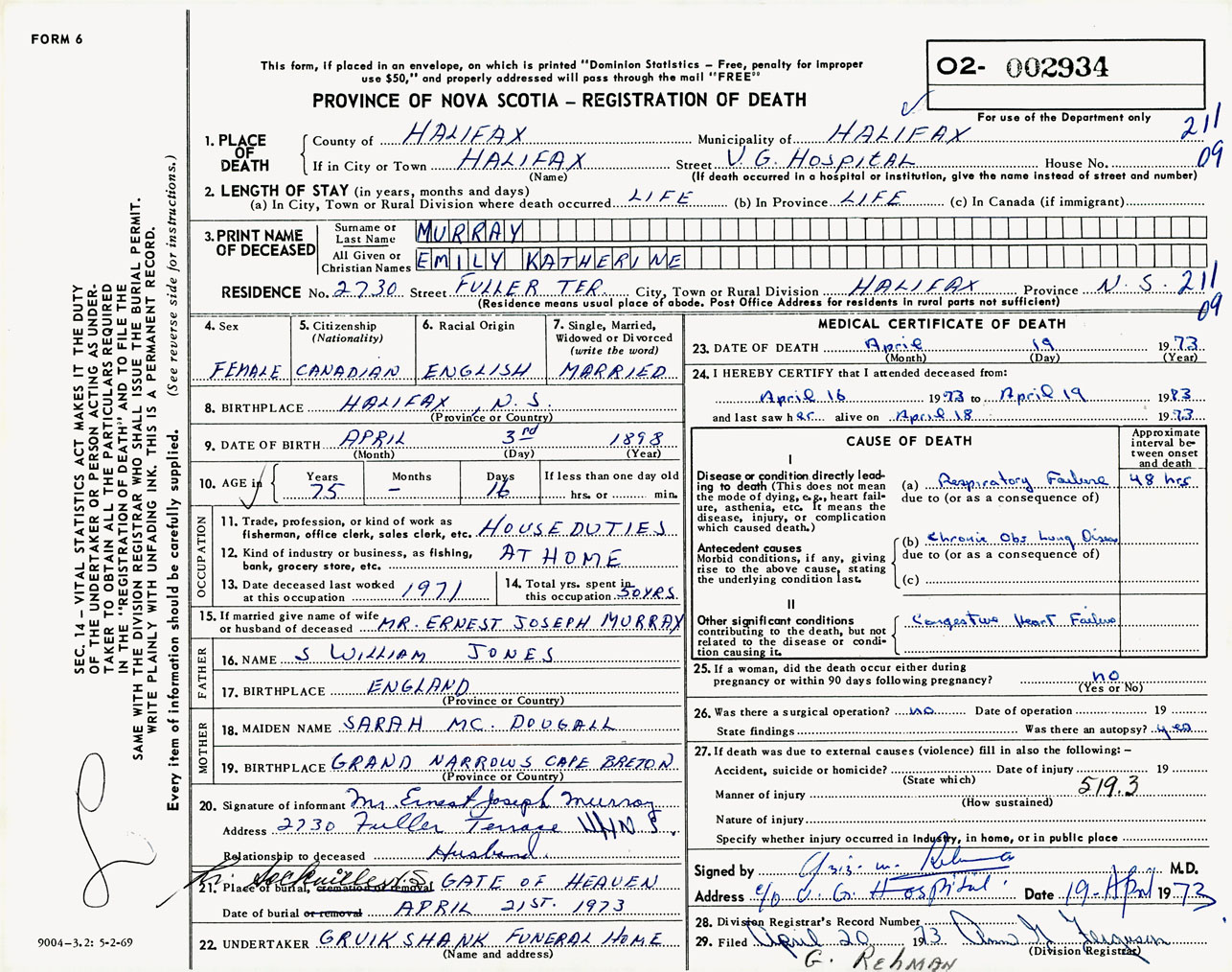 Female Death Registration: Year: 1973 number: 2934