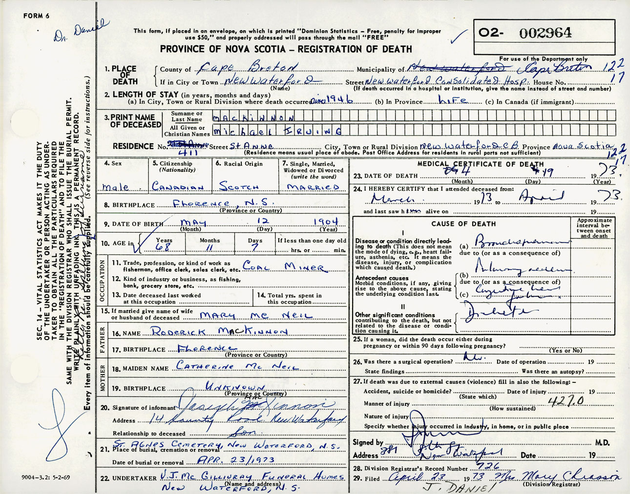 Male Death Registration: Year: 1973 number: 2964