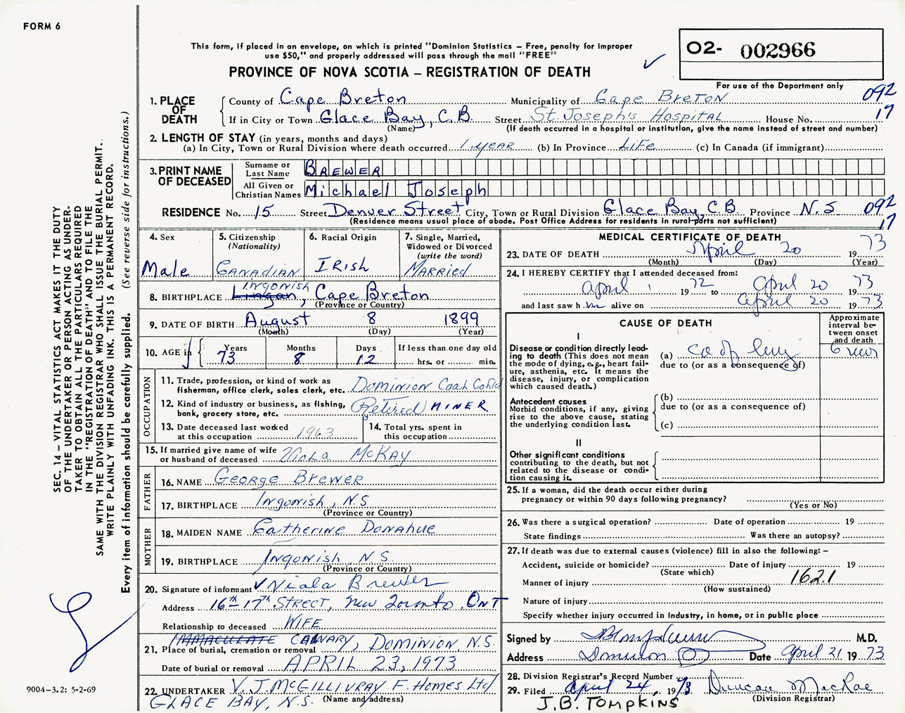 Male Death Registration: Year: 1973 number: 2966