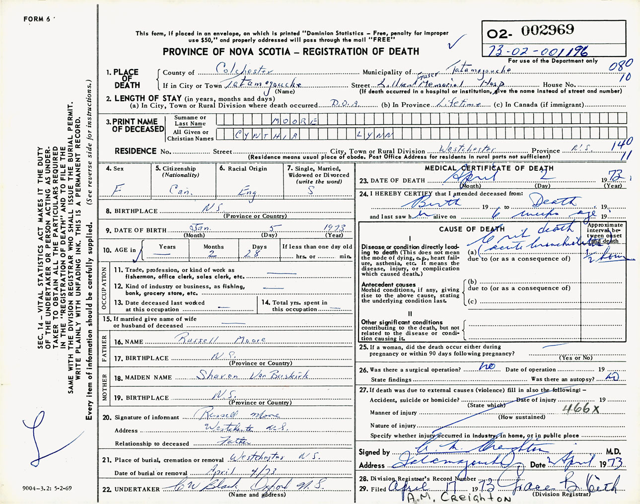 Female Death Registration: Year: 1973 number: 2969