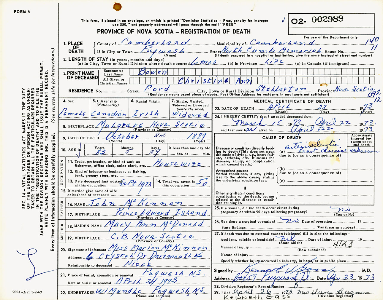 Female Death Registration: Year: 1973 number: 2989