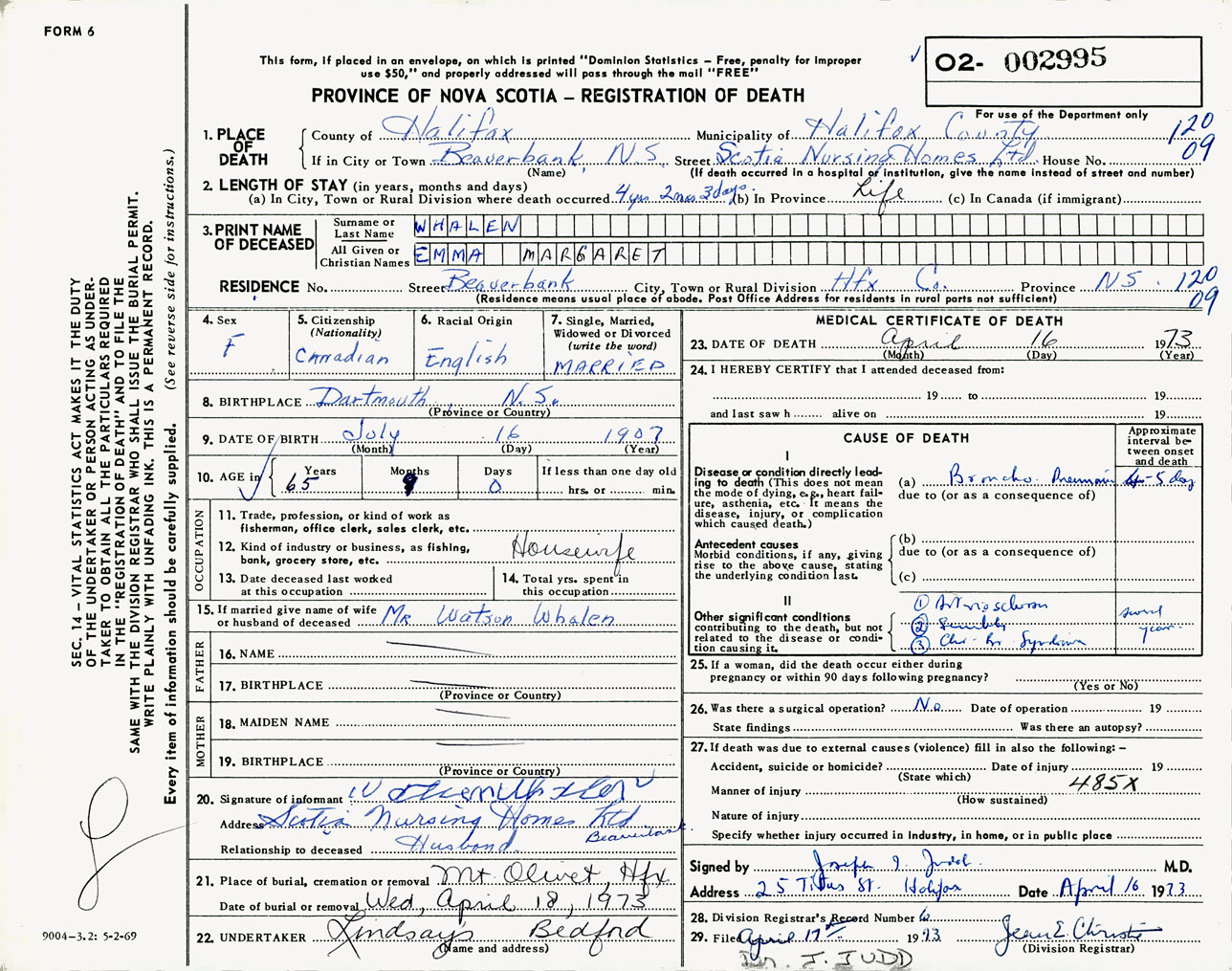Female Death Registration: Year: 1973 number: 2995