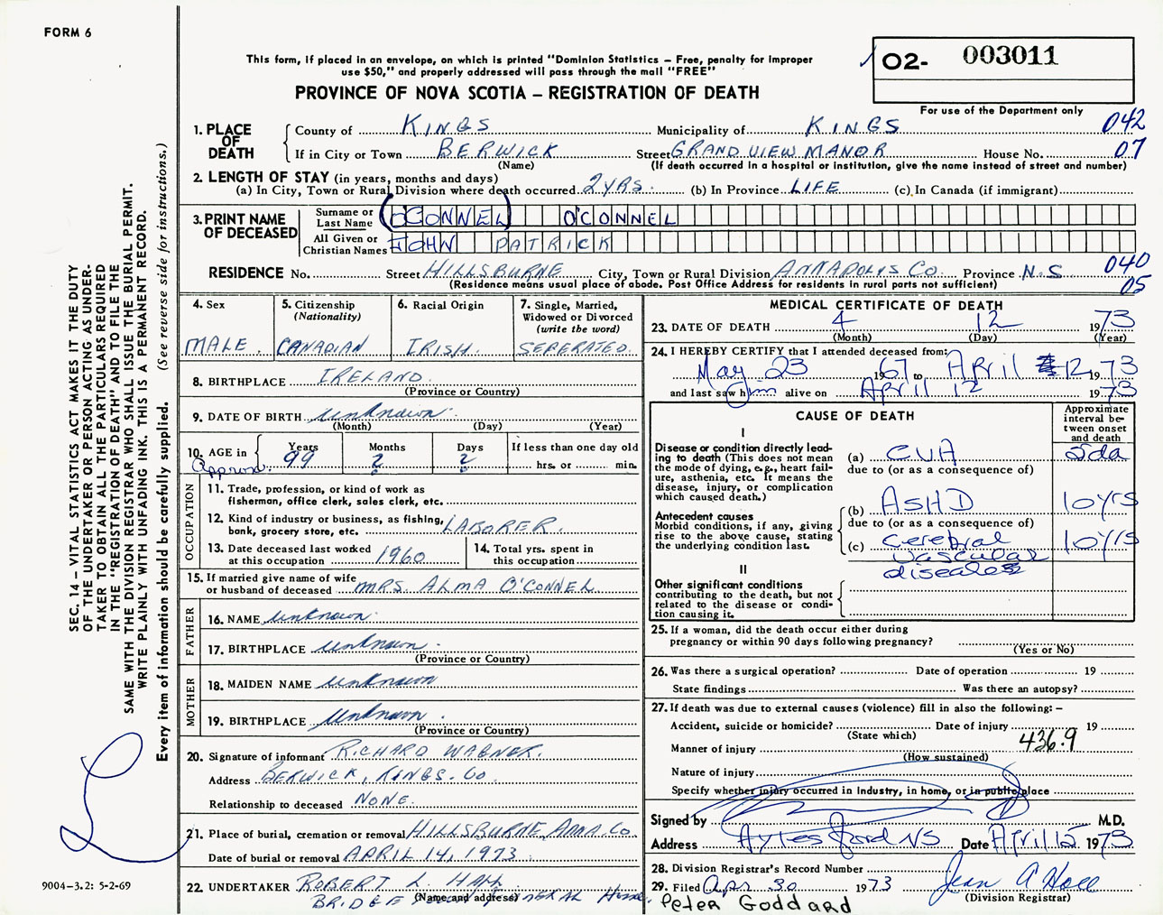 Male Death Registration: Year: 1973 number: 3011