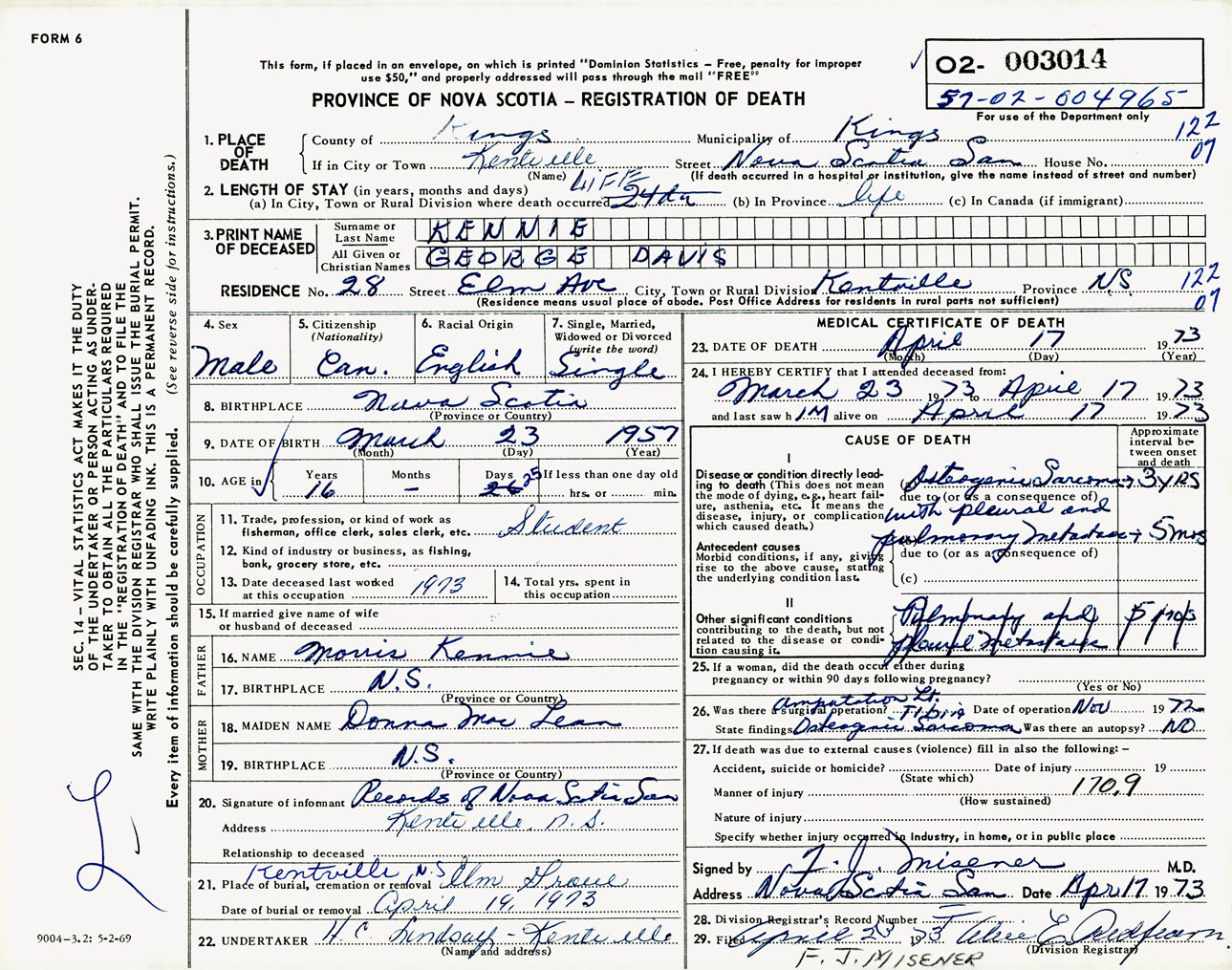 Male Death Registration: Year: 1973 number: 3014