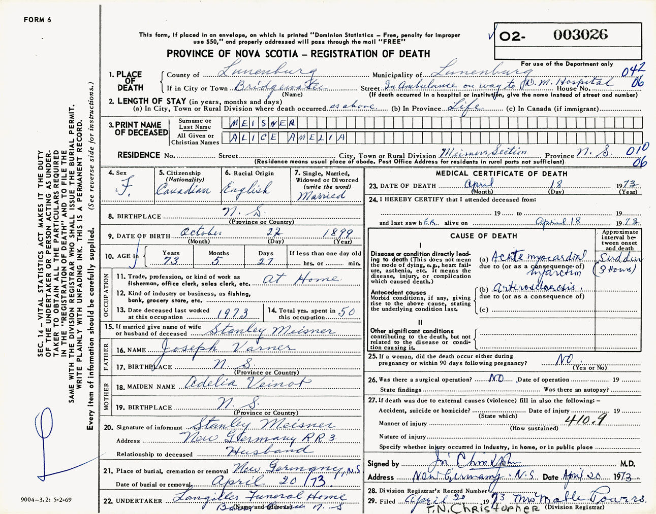 Female Death Registration: Year: 1973 number: 3026