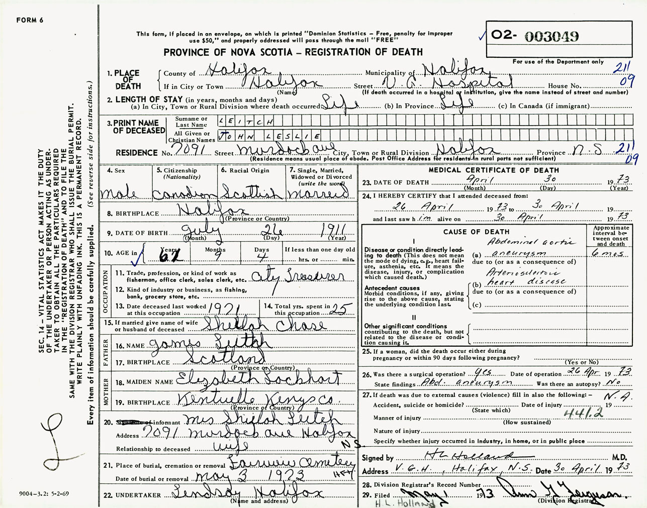 Male Death Registration: Year: 1973 number: 3049