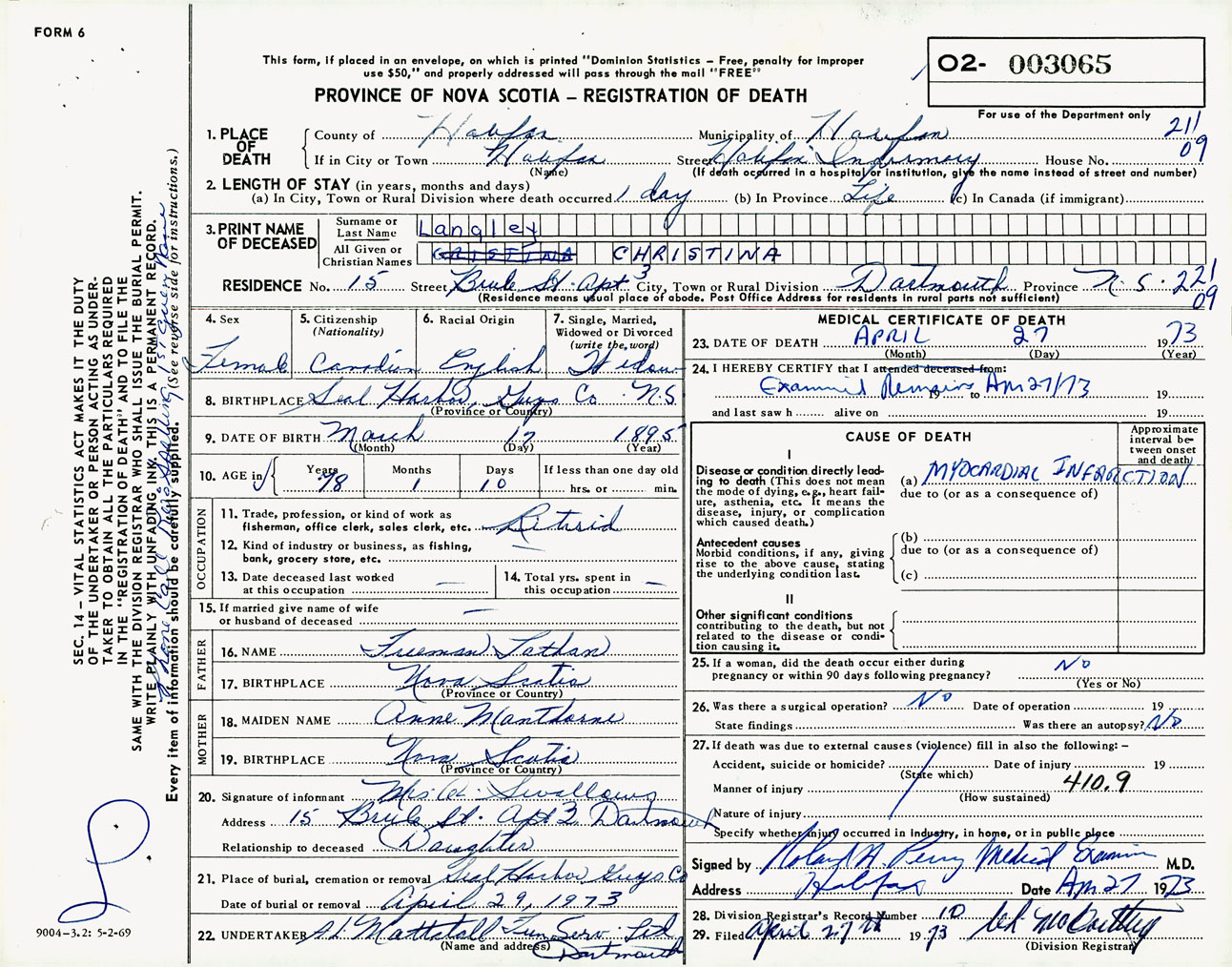 Female Death Registration: Year: 1973 number: 3065