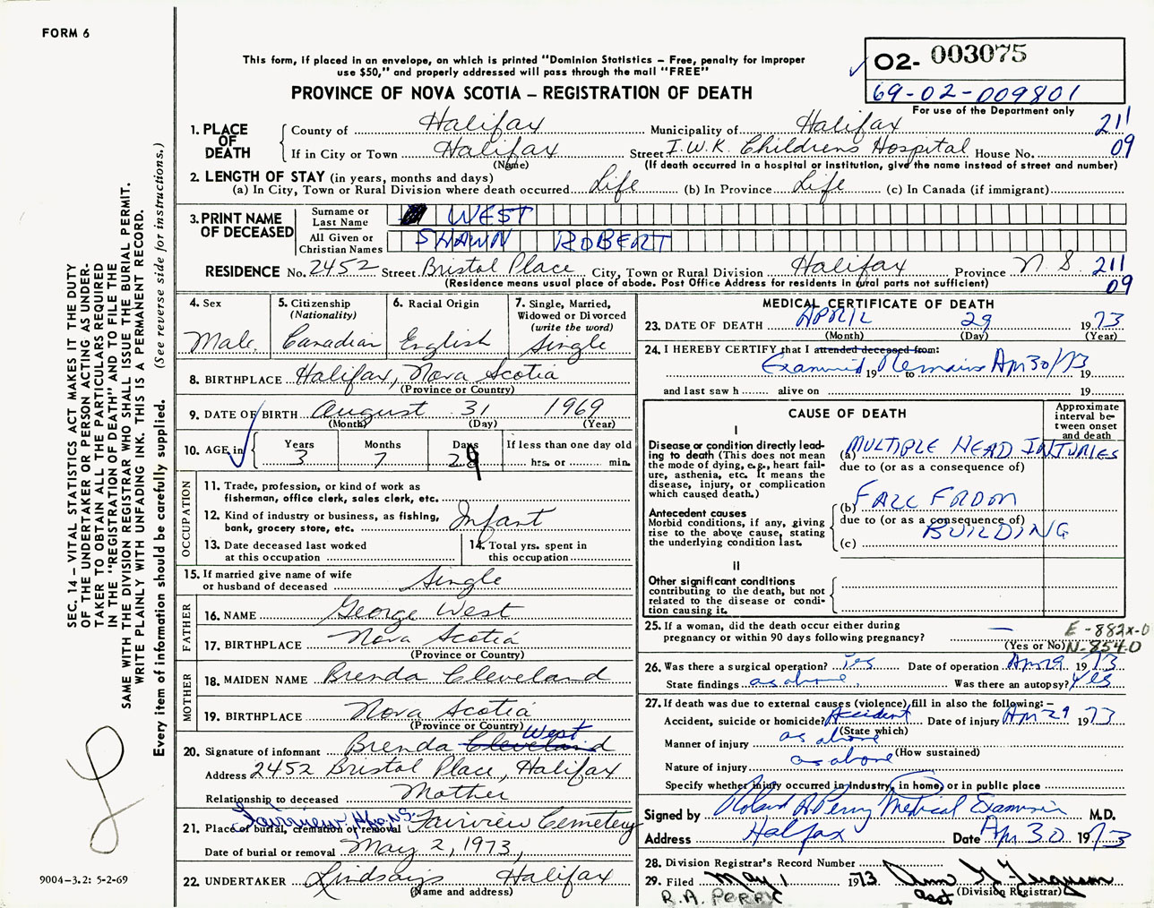 Male Death Registration: Year: 1973 number: 3075