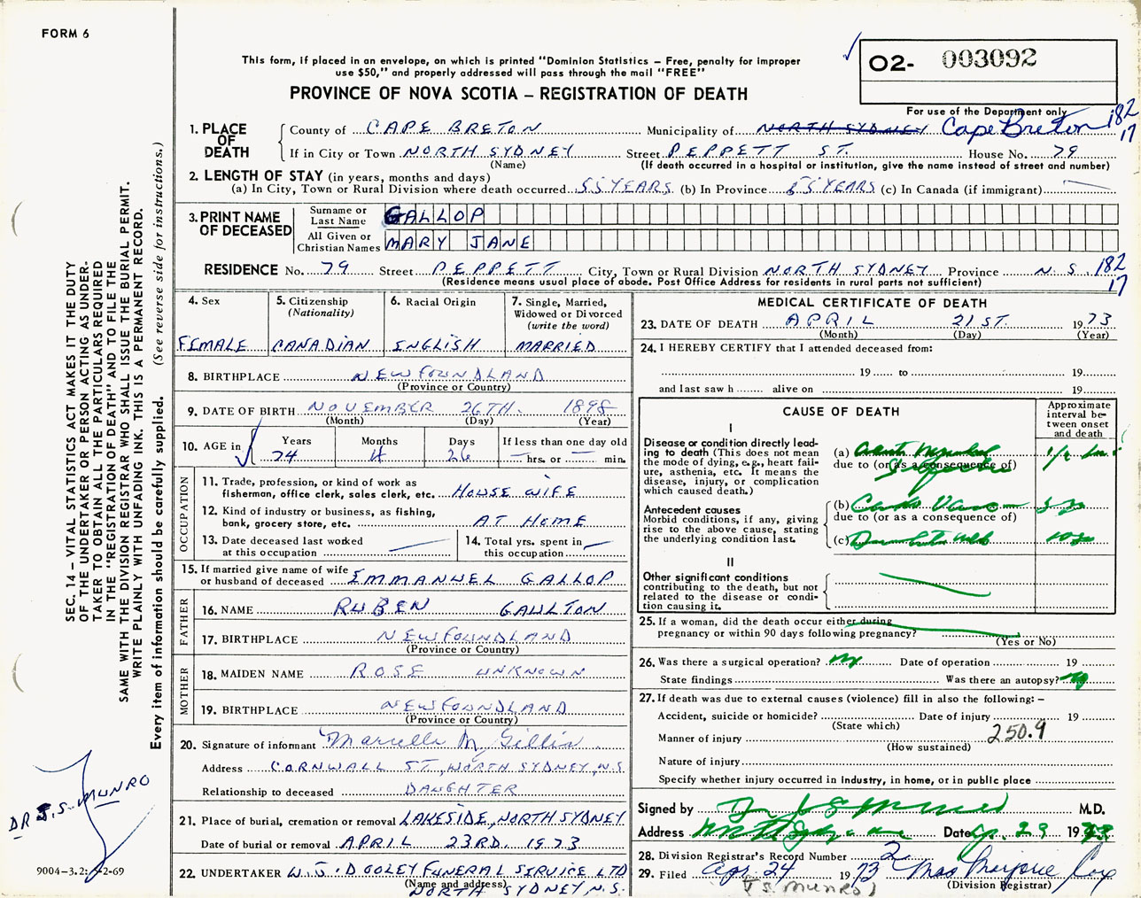Female Death Registration: Year: 1973 number: 3092