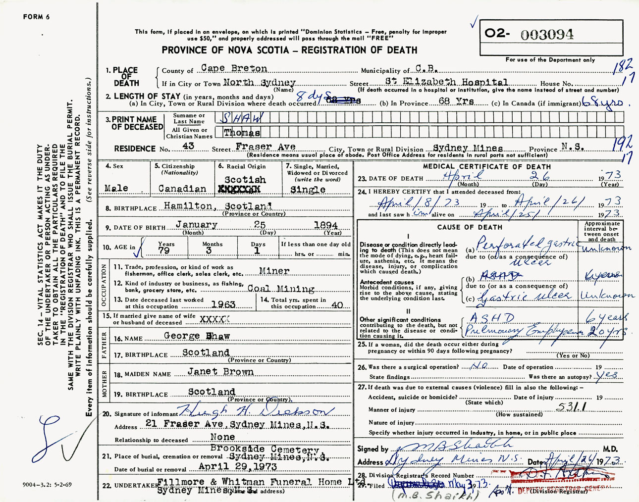 Male Death Registration: Year: 1973 number: 3094