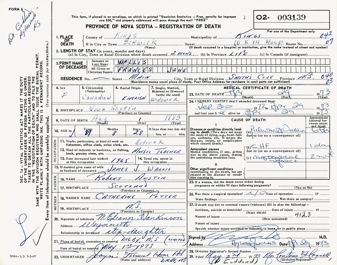 Female Death Registration: Year: 1973 number: 3139