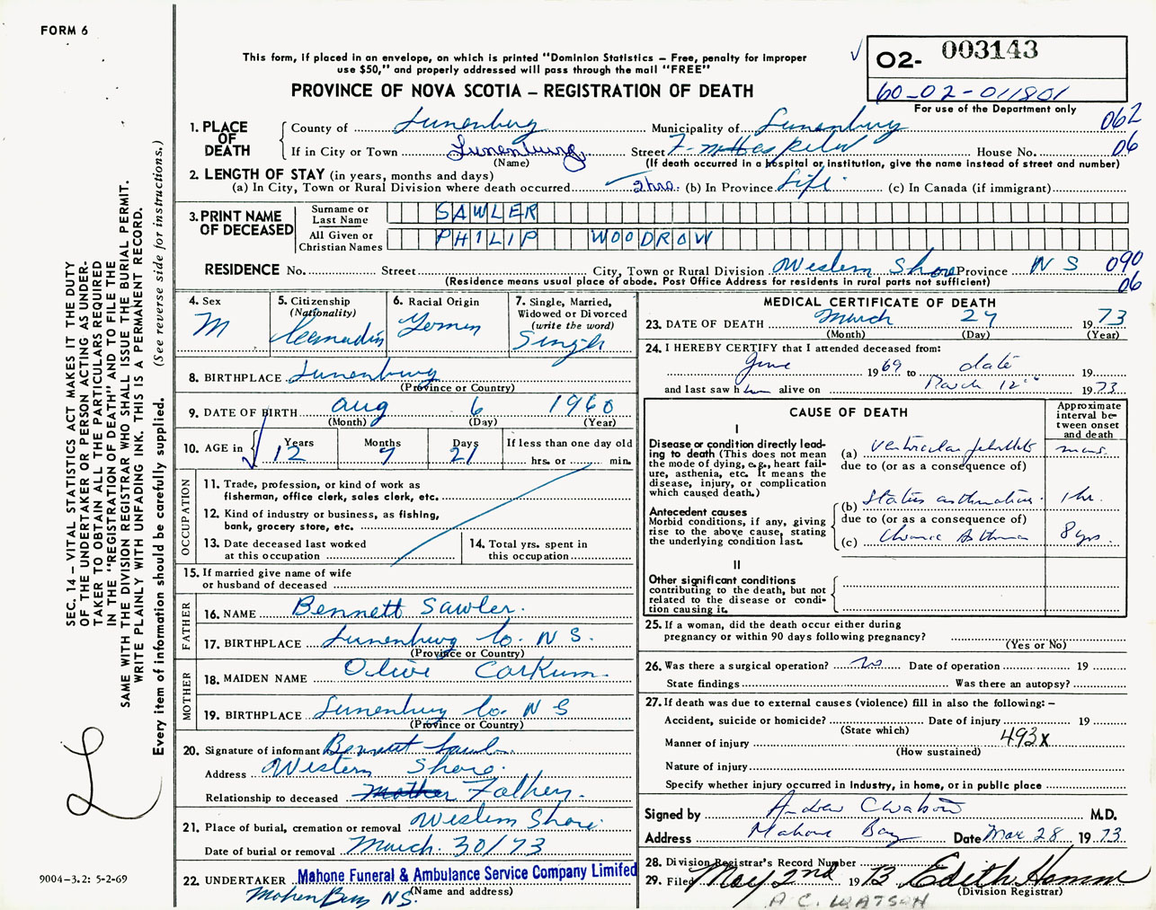 Male Death Registration: Year: 1973 number: 3143