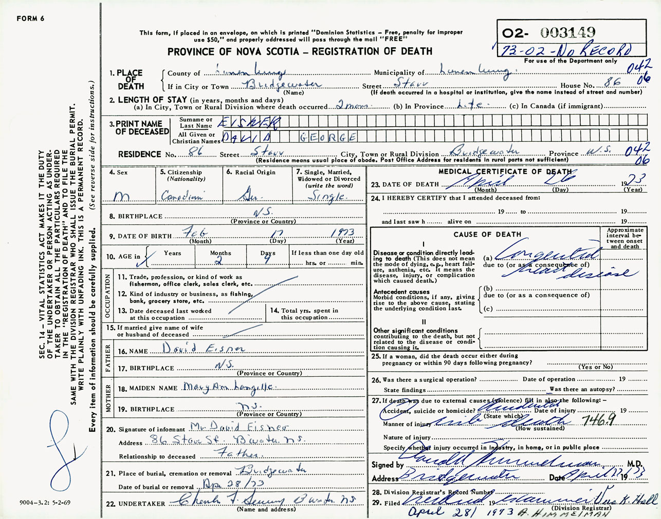 Male Death Registration: Year: 1973 number: 3149