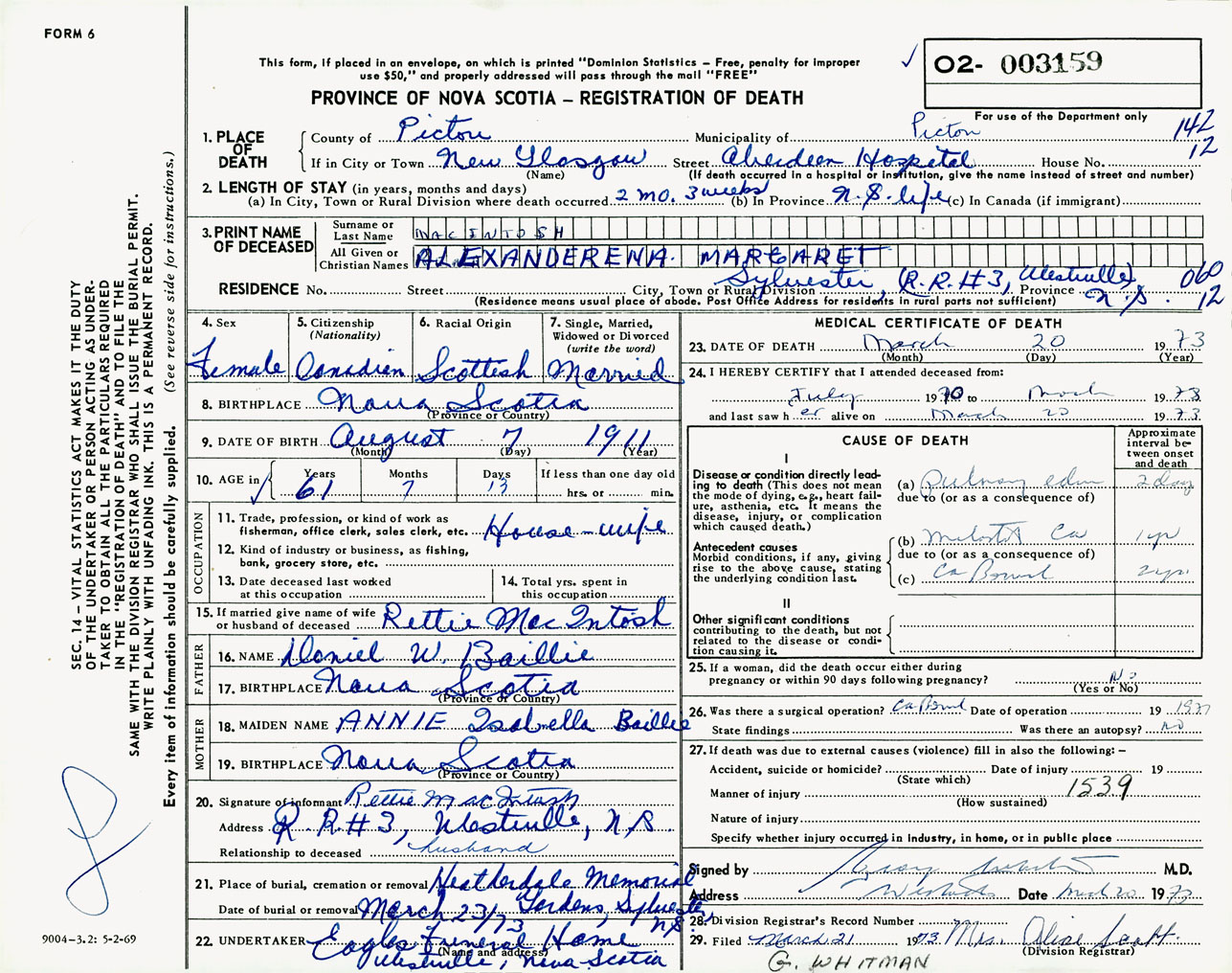 Female Death Registration: Year: 1973 number: 3159