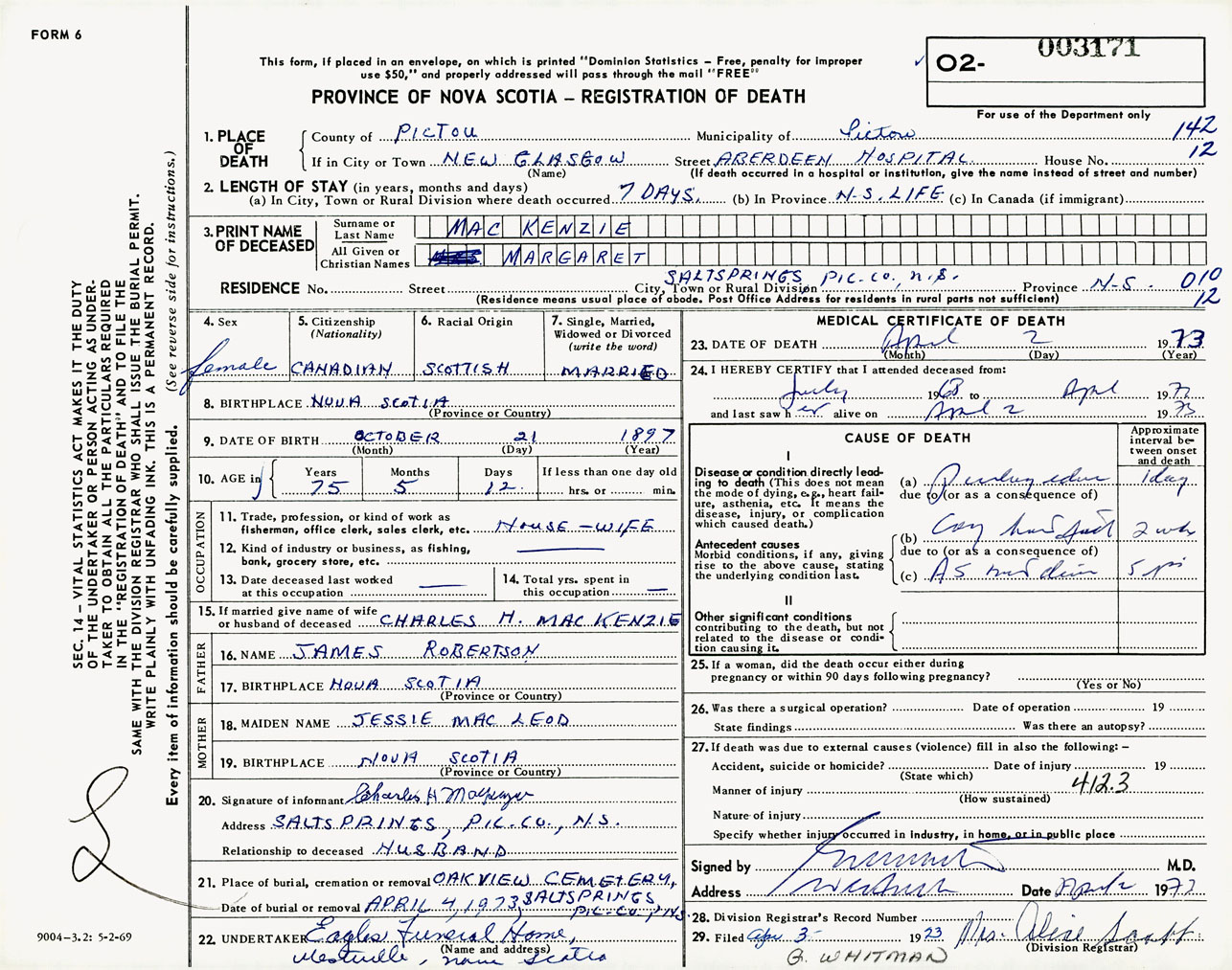 Female Death Registration: Year: 1973 number: 3171