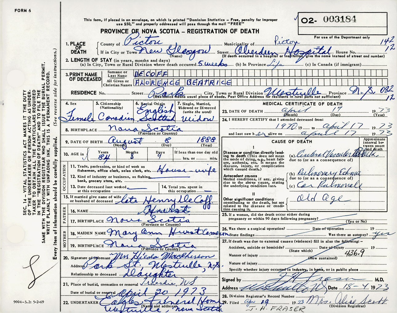 Female Death Registration: Year: 1973 number: 3184