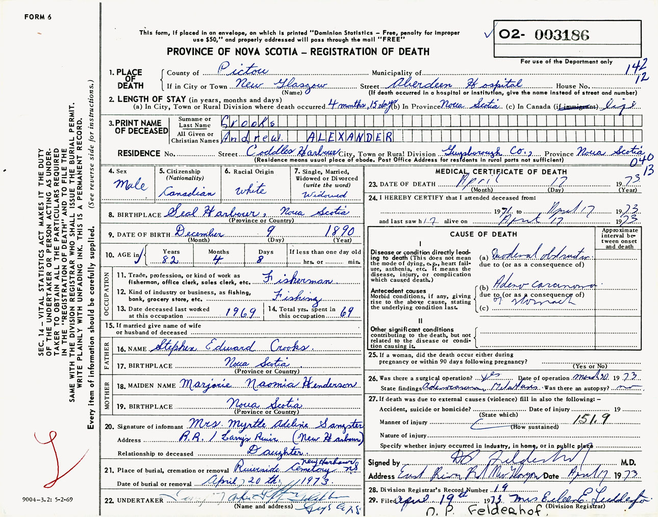 Male Death Registration: Year: 1973 number: 3186